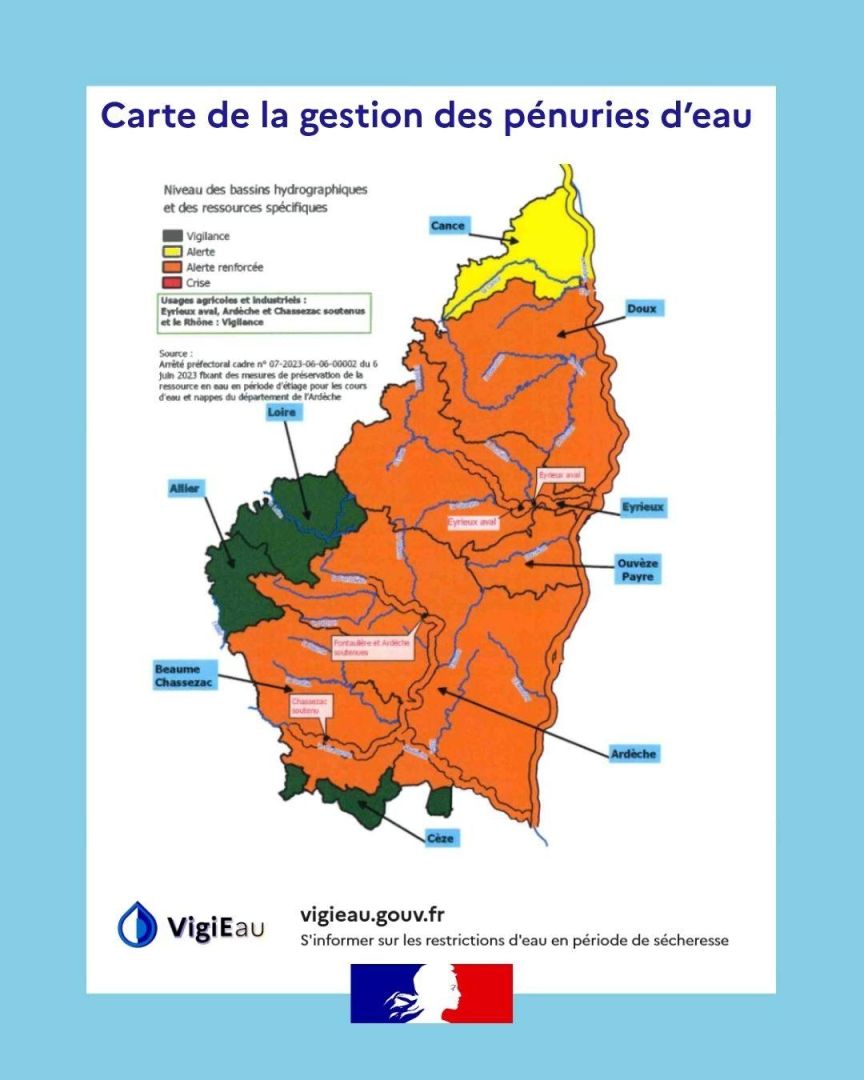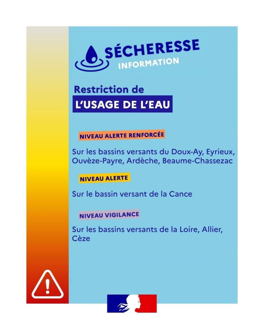 #Eau | Renforcement du niveau de restriction sur le bassin versant de Beaume-Chassezac et maintien des mesures sur les bassins versant du Doux-Ay, de l’Eyrieux, l’Ouvrez, l’Ardèche et la Cance.