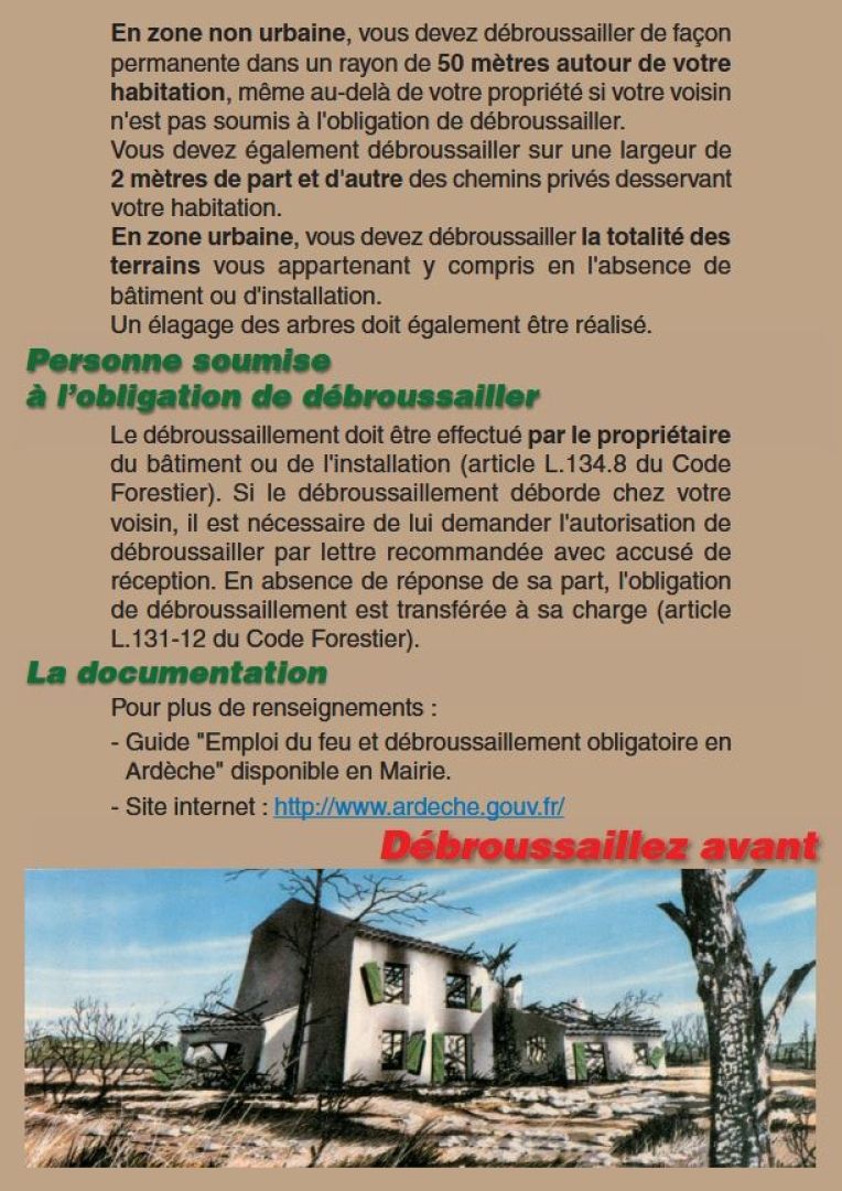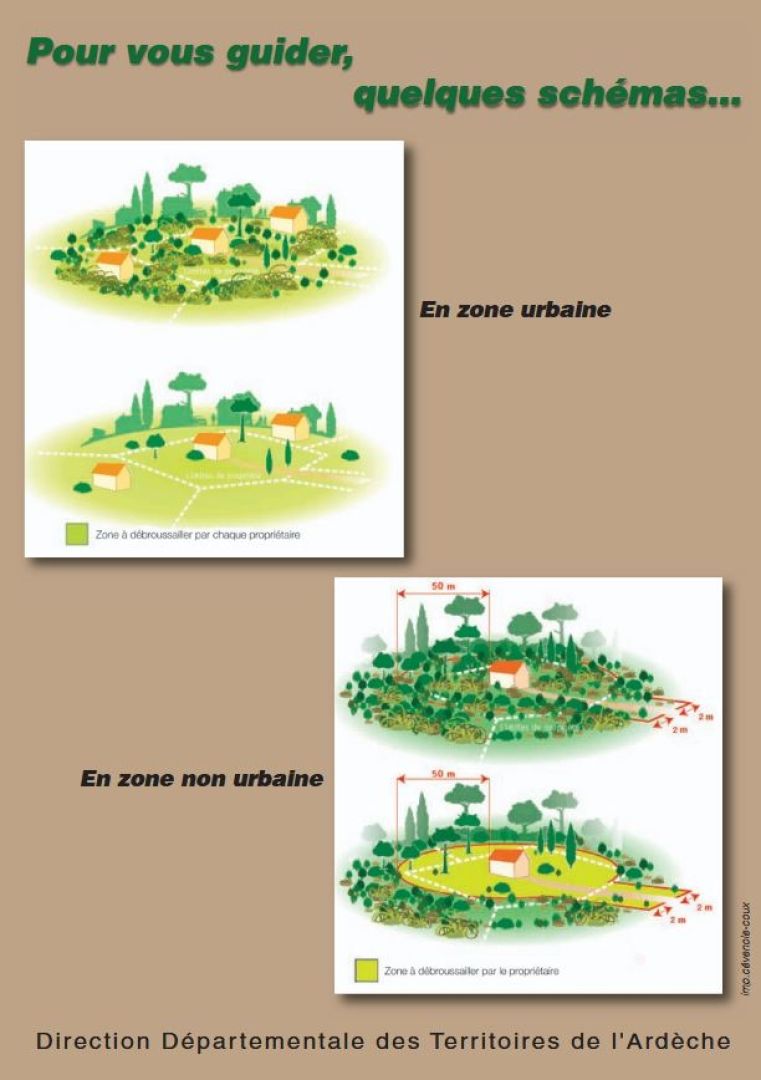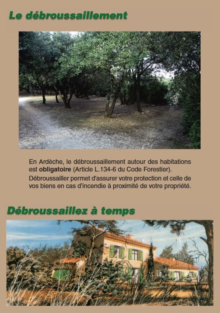 Afin d'assurer leur protection, le débroussaillement autour de bâtis situés à moins de 200 mètres des bois, forêts, landes et maquis, est obligatoire dans le département de l'Ardèche depuis 1985 (Art. L. 134-6 du code forestier).