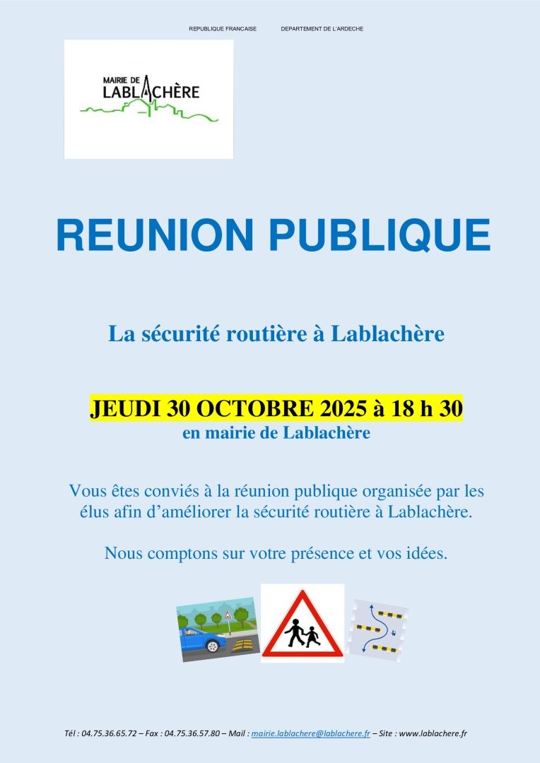 Afin de recenser des endroits sensibles et solliciter l'avis des Lablachéroises et Lablachérois sur les différentes opportunités, il est organisé une réunion publique le 30 octobre 2025 à 18h30 en mairie de Lablachère (voir affiche)